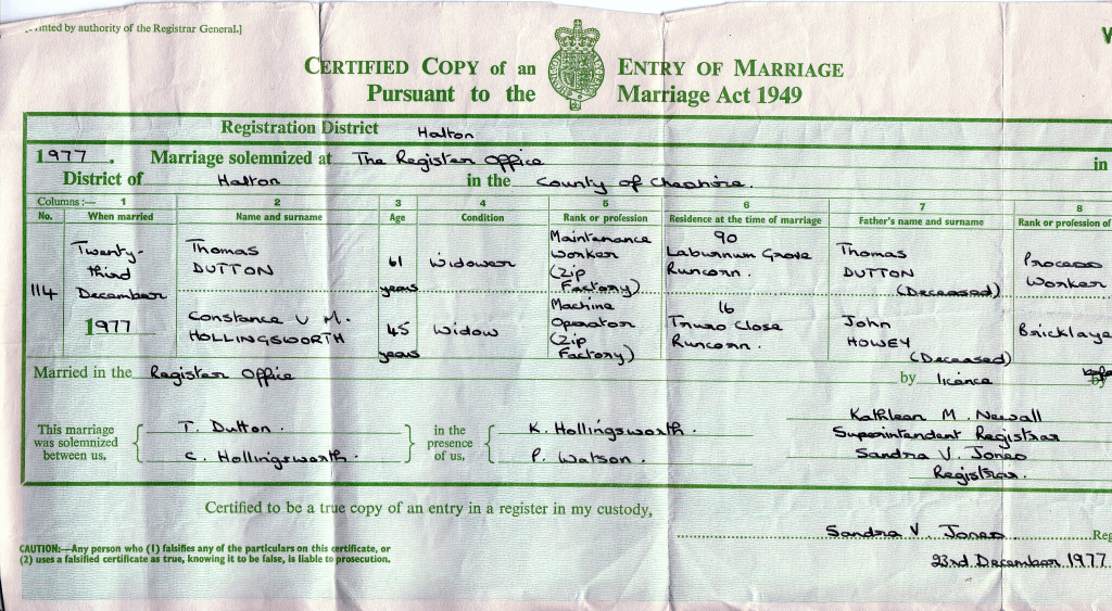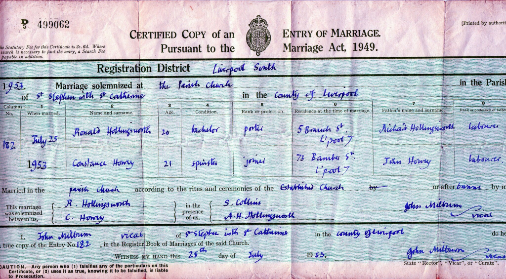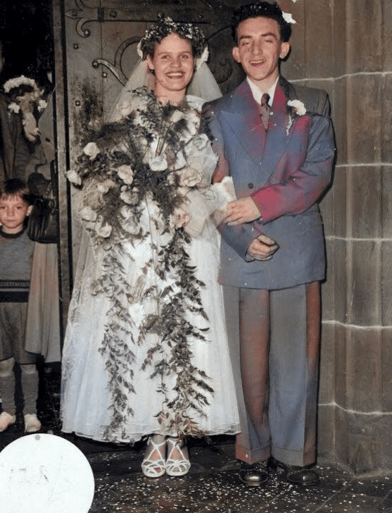 As a young woman, Connie was shy but sociable, and she enjoyed going to the cinema. She recalled her first boyfriend, Ronald (Ronnie) Hollingsworth, who lived just around the corner in Liverpool. He had courted her for some time before she agreed to date him, and their early outings consisted of “pictures, ice cream, and sweets.” They married at a church on Crown Street, Liverpool — a day she remembered for torrential rain, a too-large bridesmaid dress, and her dad walking too fast down the aisle. Despite the chaos, she described Ronnie as “the loveliest man you could think of — gentle, funny, and generous.”