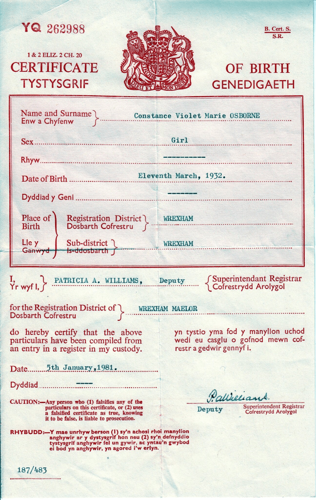 Connie was born on 11 March 1932 at Hollybush Terrace in Wrexham. Her name carried family significance — “Constance” after the doctor, “Violet” after her mother, and “Marie” after the midwife. Known affectionately as “Connie,” she spent her early years in a cottage-style home before the family moved around frequently due to her mother’s love of country life and farming.