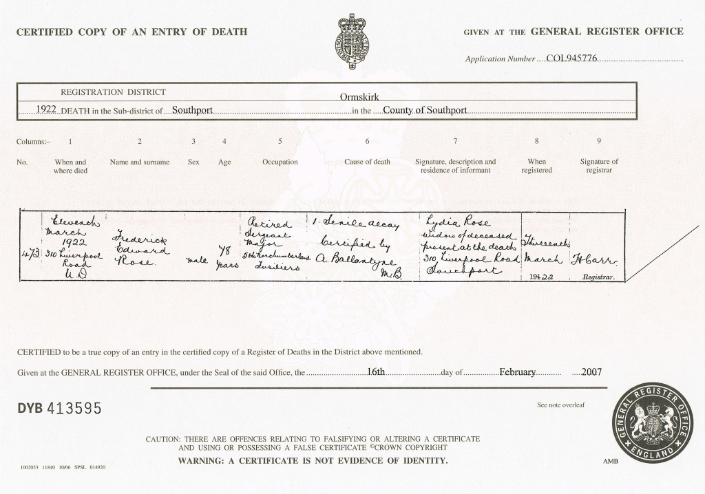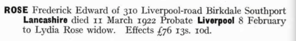 Frederick Edward Rose died on 11 March 1922 in Ormskirk, Lancashire, just three days before what would have been his 82nd birthday.