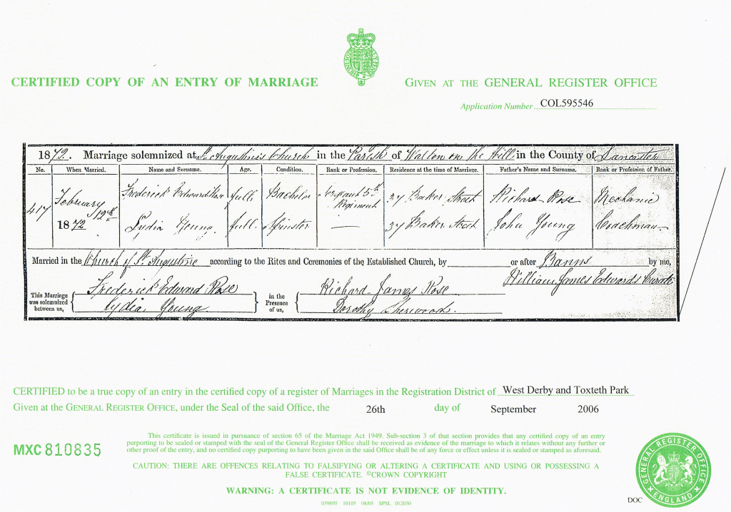Frederick’s personal life took a significant turn during this period. On 12 February 1872, he was married to Lydia Young at St. Augustine’s Church in Liverpool and went to Manchester.