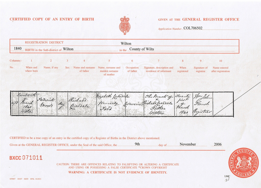 Genealogical research has uncovered compelling evidence that Frederick Edward Rose was actually born Frederick Edward Curedale on 14 March 1840 in Wilton, Wiltshire, to Richard Curedale, a cordwainer (skilled shoemaker), and Elizabeth. This discovery emerged through meticulous detective work examining birth certificates, census records, and family documentation that reveals a fascinating case of Victorian-era surname adoption. The birth certificate for Frederick Edward Curedale matches perfectly with Frederick’s autobiographical details regarding his birth date and circumstances, while subsequent family records demonstrate a gradual transition from “Curedale” to “Rose” during the 1840s.