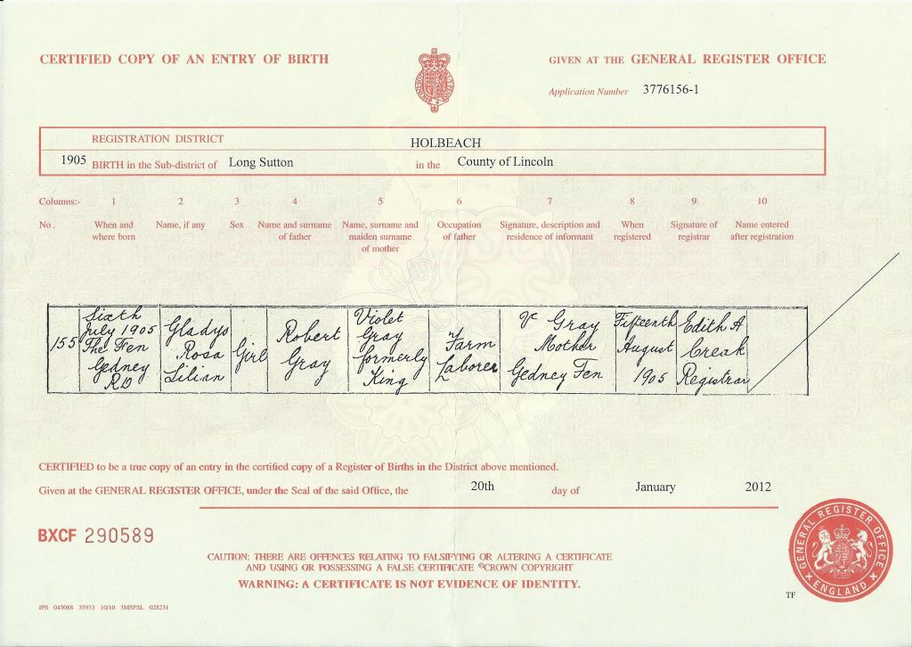 Certified copy of the birth registration for Gladys Rosa Lillian Gray, born in 1905 in the Lincolnshire Fens.