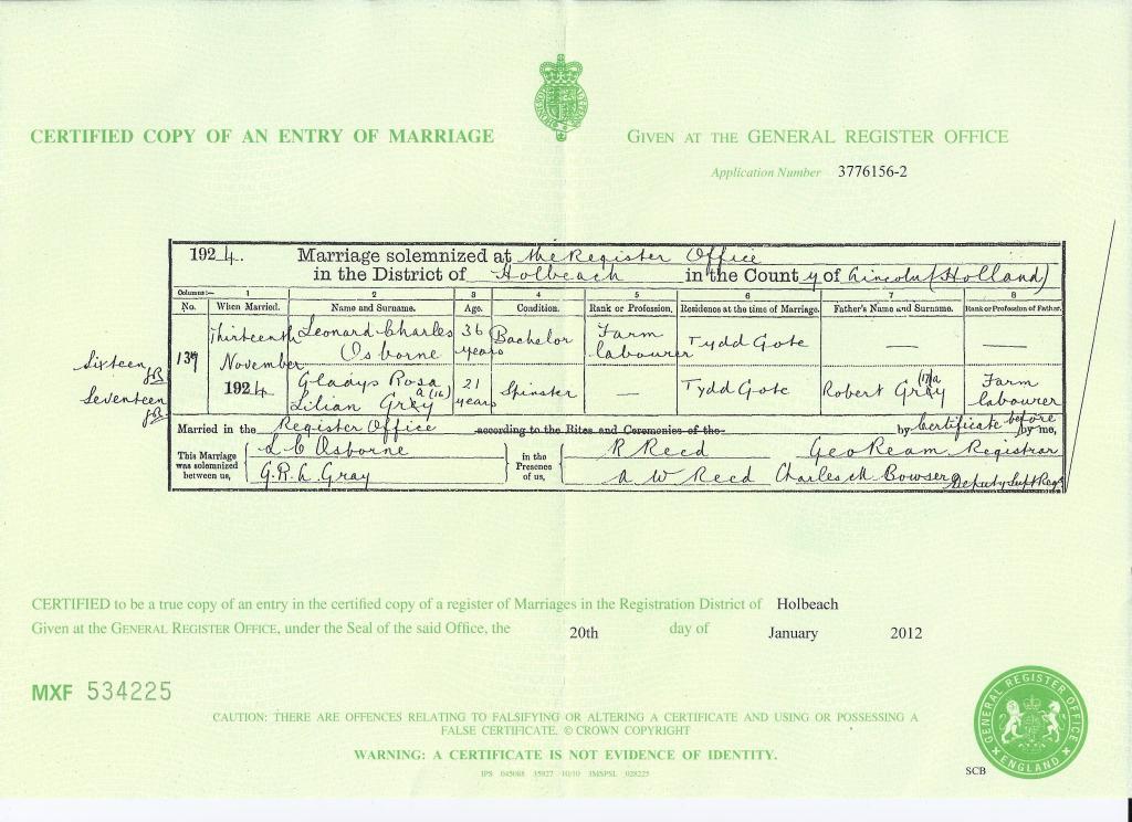 At 19, Gladys married Leonard Charles Osborne, a 36-year-old farm labourer, at the Holbeach Register Office on 17 November 1924. The witnesses were J. G. Osborne and G. R. L. Gray. For a young woman from the Fens, marriage to a stable labourer offered a rare promise of permanence.