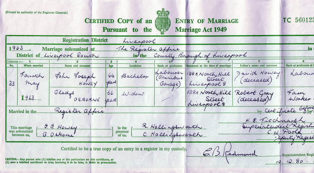 After more than 30 years together, Gladys and John were finally able to marry on 4 May 1963 at the Liverpool South Registry Office. She was 57; he was 64. Their daughter Constance and her husband Ronald Hollingsworth witnessed the ceremony — a symbolic moment that united the family across generations.