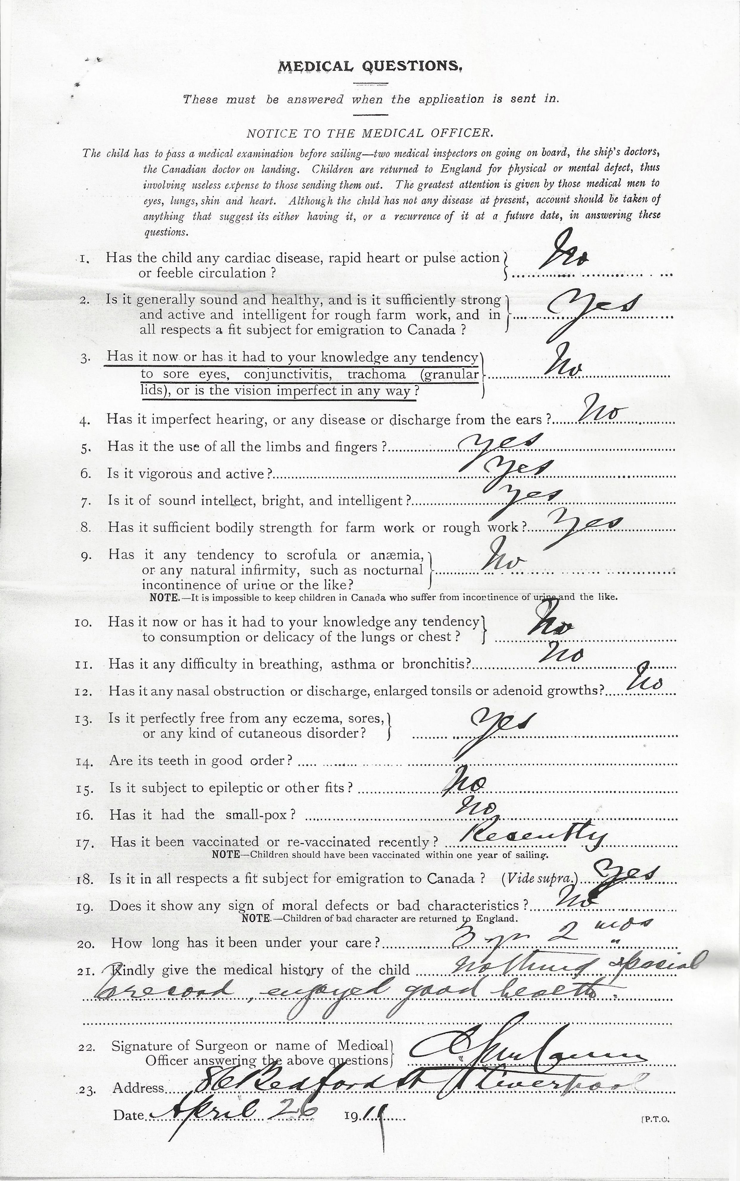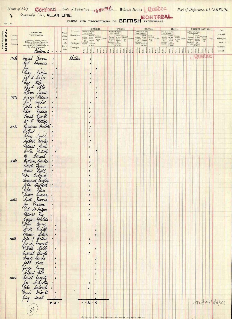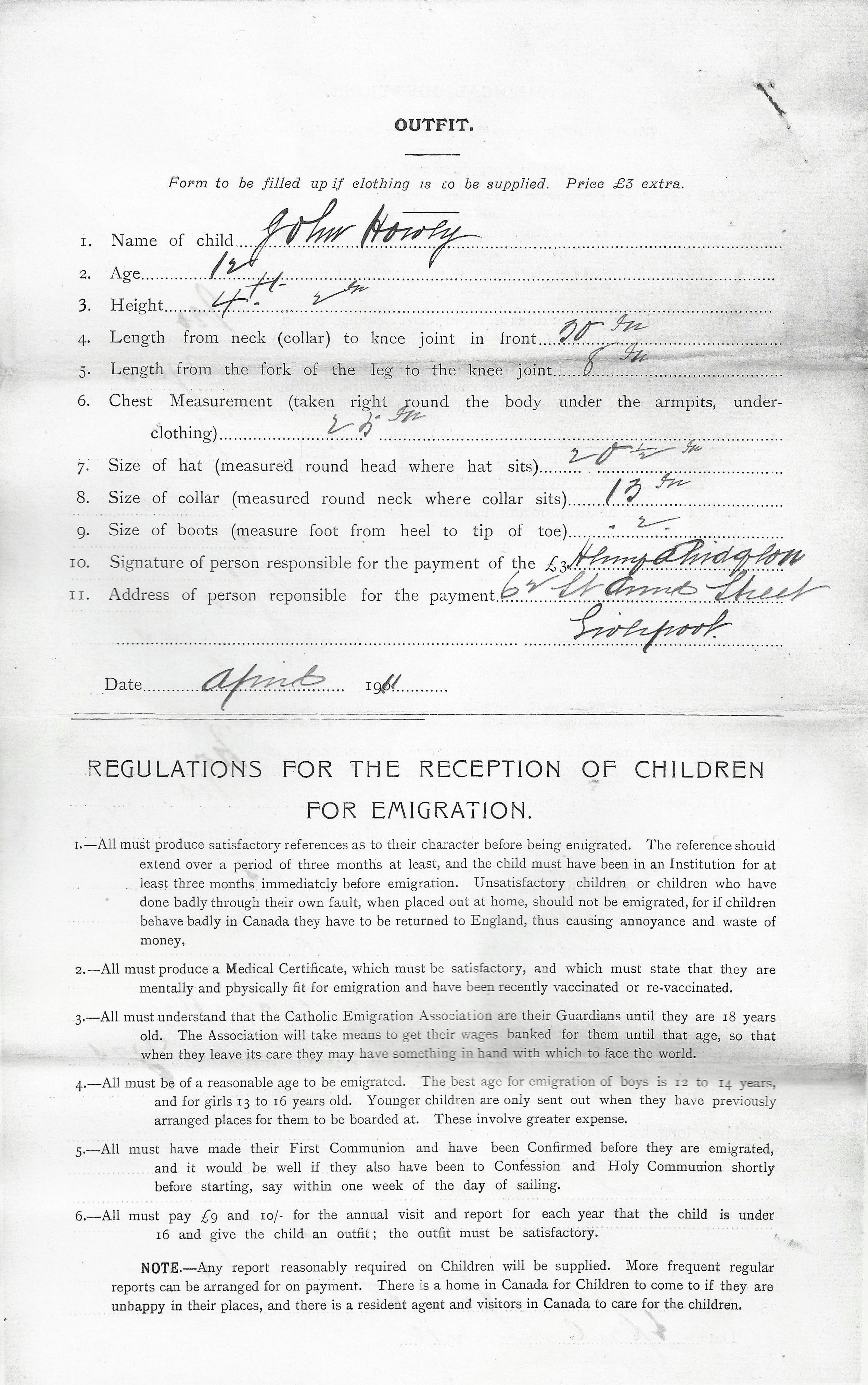 On 18 May 1911, just ten days before his thirteenth birthday, John departed Liverpool aboard the RMS Corsican as part of a group sent by the Catholic Emigration Association. The Catholic Emigration Association, which operated homes in Liverpool and Canada, was one of over 50 organizations that facilitated the migration of more than 100,000 British children to Canada between 1869 and 1948.