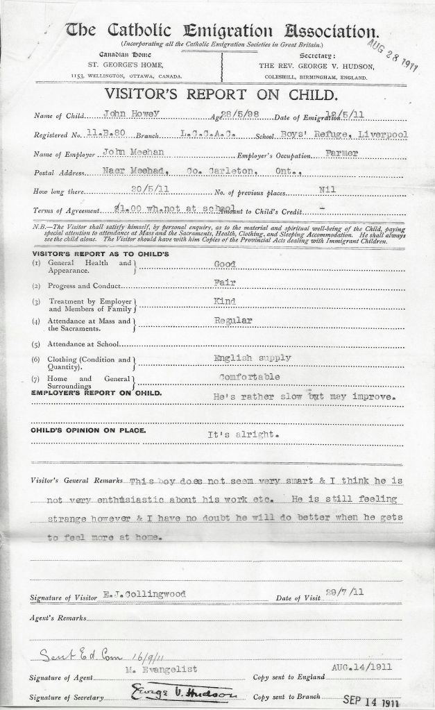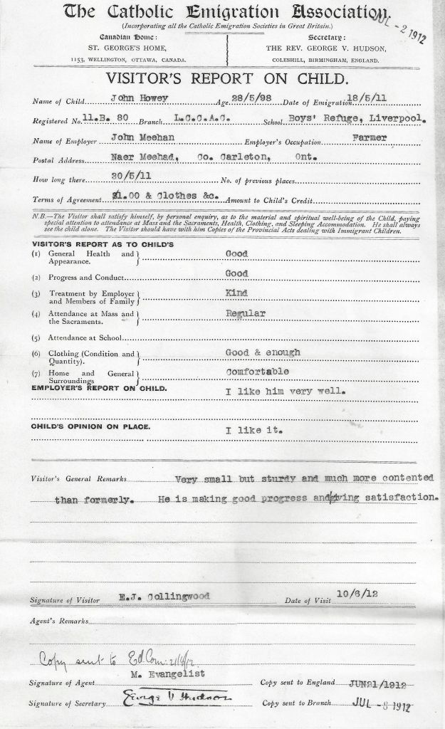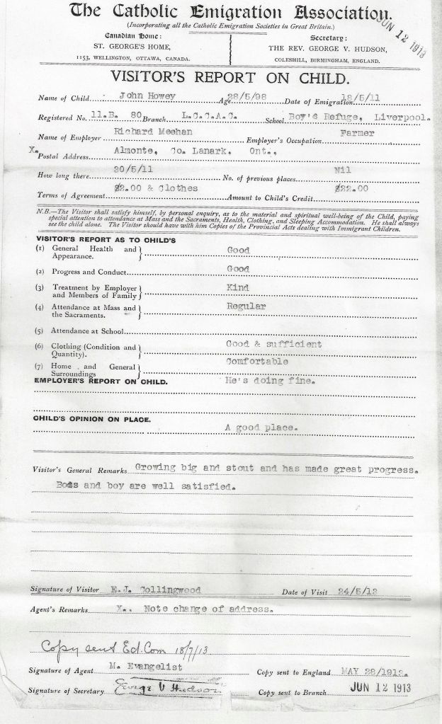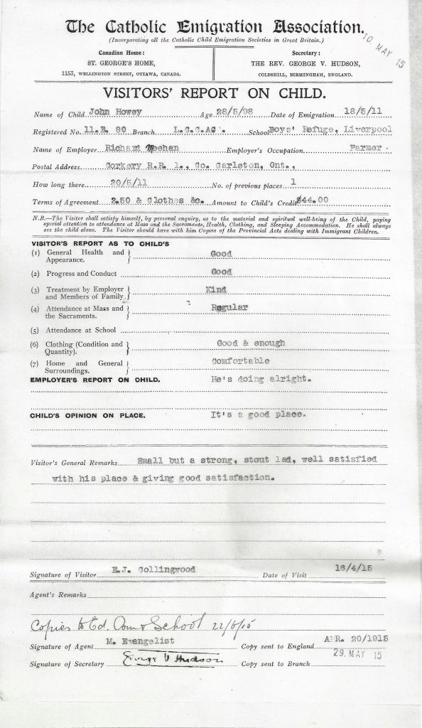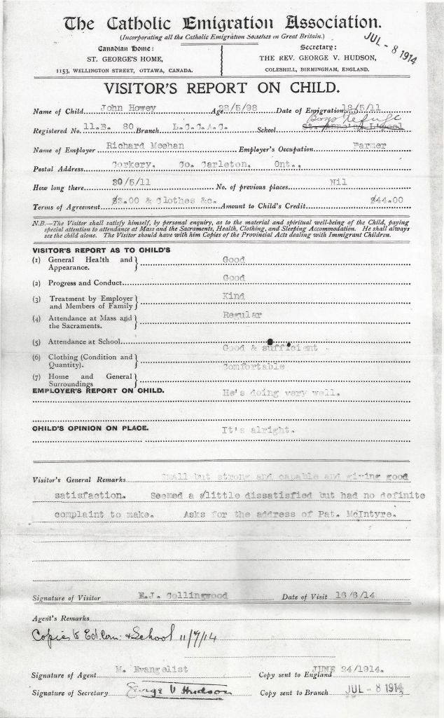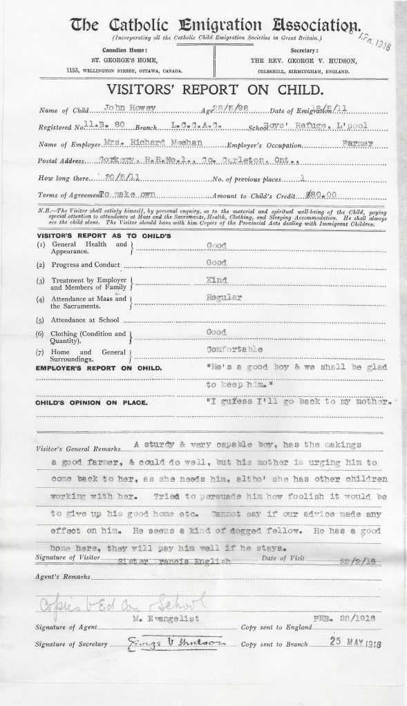 Upon arrival in Canada, John was placed with farming families in Ontario, where he worked as a farm laborer. The visitor reports from the Catholic Emigration Association provide revealing glimpses into his circumstances during these formative years. These inspection reports, conducted by social workers from the Catholic Emigration Association, documented children’s living conditions, treatment by employers, and progress in their placements.