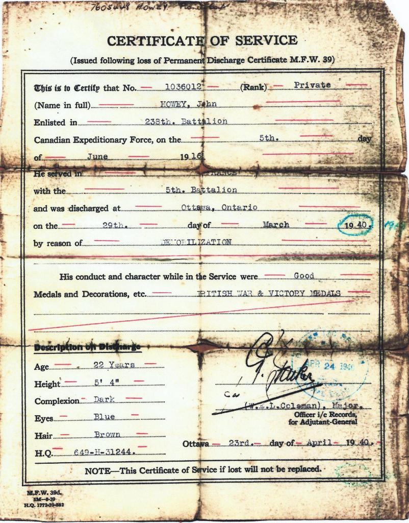in 1916, John made a decision that would define the next phase of his life: he enlisted in the Canadian Expeditionary Force. On 5 June 1916 in Ottawa, Ontario, the seventeen-year-old John (claiming to be eighteen) attested for service with the 238th Infantry Battalion, CEF. His attestation papers provide detailed information about his circumstances at enlistment.