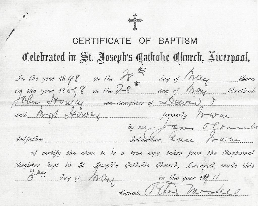 John Joseph Howey was born on 28 May 1898 in Liverpool, Lancashire, England, into a Roman Catholic family of modest means. His father was David Howey (born circa 1864), aged 34 at John’s birth, who originated from South Wales. His mother was Margaret Howey (née Irwin) (born circa 1870), aged 28 when John was born. According to his baptismal certificate from St Joseph’s Catholic Church in Liverpool, he was baptized on 28 May 1898.