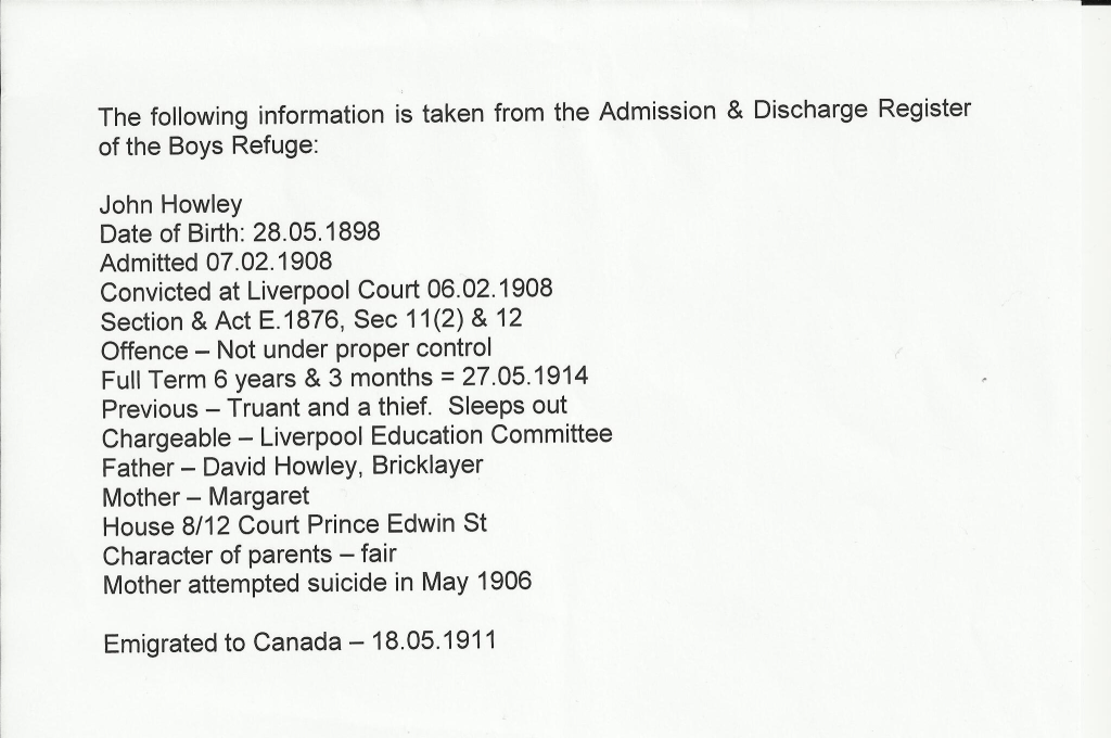 John Joseph Howey’s life trajectory exemplifies the experiences of countless working-class individuals whose lives were shaped by the major historical forces of the twentieth century: poverty, juvenile justice failures, imperial child migration schemes, industrialized warfare, economic hardship, and social transformation. Born in Liverpool to David Howey and Margaret Irwin, institutionalized at ten years old, sent to Canada as a child labourer, serving in two world wars, and raising a large family through decades of austerity, John demonstrated remarkable resilience and adaptability.