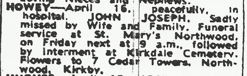 After demobilization, John spent the remaining twenty-two years of his life in Liverpool, working as a labourer to support his large family. The post-war years in Britain were characterized by austerity, rationing, and economic hardship, and working-class families like the Howey’s faced ongoing challenges. Nevertheless, John and Gladys maintained their household and raised their children through these difficult decades.