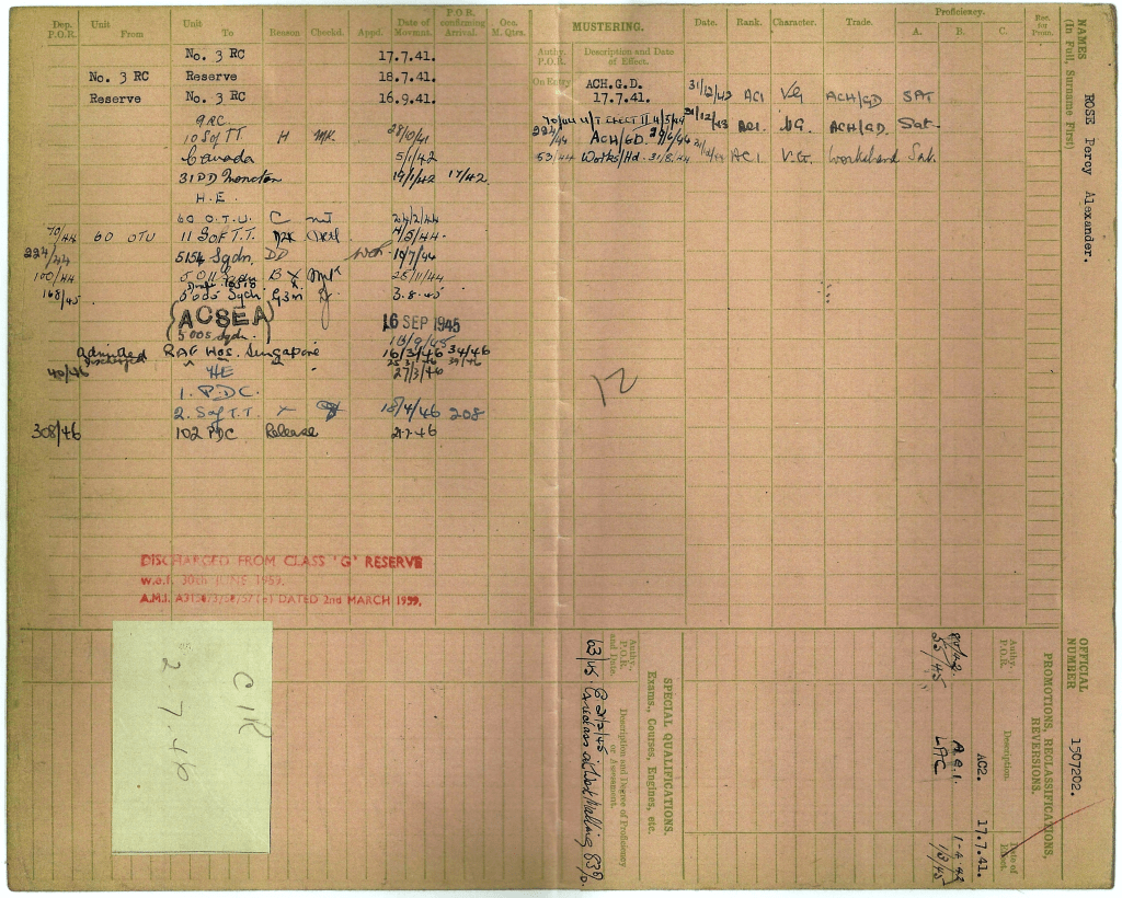 In 1946, Percy was posted to Singapore as part of Britain’s post-war reorganisation of the RAF in Southeast Asia, marking his final overseas assignment before demobilisation. His release book records his conduct as exemplary, noting his diligence, reliability, and devotion to duty during more than five years of wartime and post-war service.