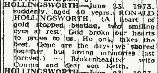 Heart disease was sadly common among working-class men of that generation — the product of demanding physical labour, shift work, smoking, and the stress of providing for a family. His sudden death left Connie and 15-year-old son facing an uncertain future, like so many families who lost their breadwinners in that era.
