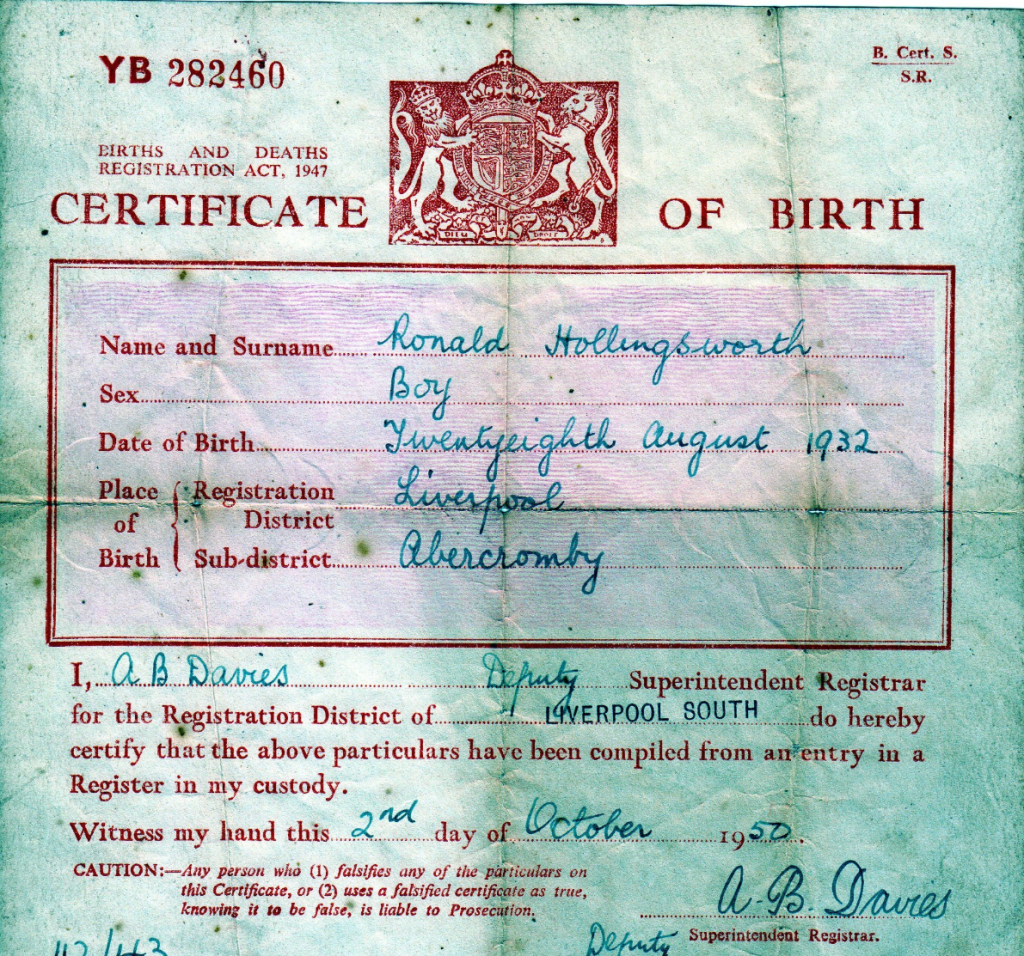 Ronald “Ronnie” Hollingsworth was born on 28 August 1932 in the heart of Liverpool, the eldest son of Richard Hughson Hollingsworth and Mary Burns. His parents were already in their forties when he arrived, a later-in-life child in a city still feeling the shadow of the Great Depression. Liverpool in the 1930s was a place of resilience — tight-knit families, terraced streets, and a shared determination to get by no matter what life threw at you.