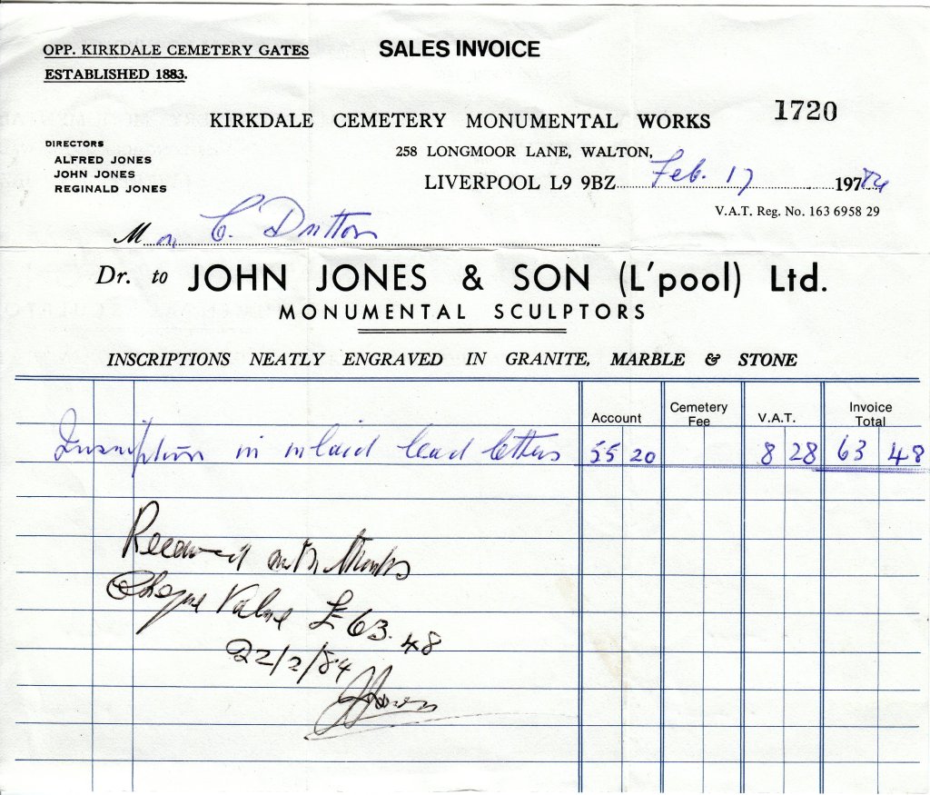 Ronnie was laid to rest in Kirkdale Cemetery on 26 June 1973, just three days after his passing. His grave lies among thousands of others belonging to Liverpool’s working men and women — dockers, railwaymen, and factory workers whose lives built the fabric of the city.